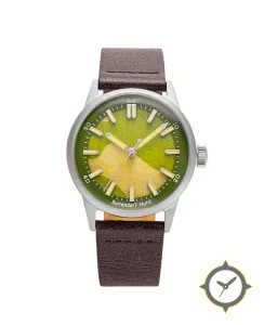 Eine Field-Uhr mit einem markanten 49.5mm Auftritt am Handgelenk, gefertigt aus Edelstahl mit einem Zifferblatt in grün und einer besonderen "textured/canvas-like weave"-Oberfläche.