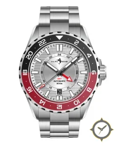 Eine GMT-Uhr mit einem markanten 42mm Auftritt am Handgelenk, gefertigt aus Edelstahl mit einem Zifferblatt in silber und einer besonderen "brushed with horizontal grooves and sunburst inner ring"-Oberfläche und einer echten GMT-Funktion, mit der du eine zweite Zeitzone verfolgen kannst.