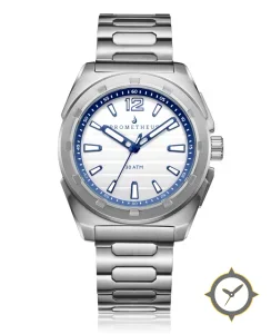 Eine Taucheruhr-Uhr gefertigt aus Edelstahl mit einem Zifferblatt in weiß und einer besonderen "subtle horizontal striped/wave texture"-Oberfläche.