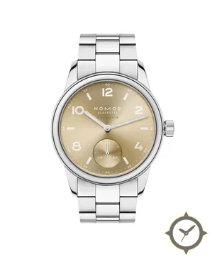 Eine Dress-Uhr mit einem 37mm Gehäuse im Vintage-Stil gefertigt aus Edelstahl mit einem Zifferblatt in gold und einer besonderen "radial sunburst"-Oberfläche.