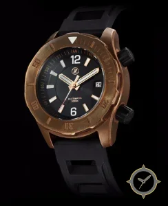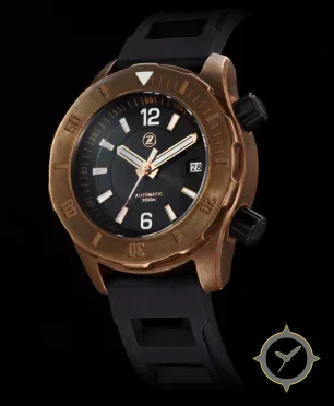 Eine Taucheruhr-Uhr mit einem vielseitigen 40.5mm Gehäuse, das an fast jedes Handgelenk passt, gefertigt aus Bronze mit einem Zifferblatt in schwarz und einer besonderen "sunburst"-Oberfläche.