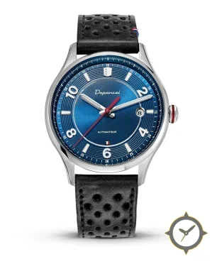 Eine Racing-Uhr mit einem markanten 44mm Auftritt am Handgelenk, gefertigt aus Edelstahl mit einem Zifferblatt in blau und einer besonderen "sunburst with concentric grooved rings"-Oberfläche.