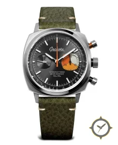 Eine Chronograph-Uhr mit einem markanten 41.5mm Auftritt am Handgelenk, gefertigt aus Edelstahl mit einem Zifferblatt in grau und einer besonderen "sunburst / radial brushed"-Oberfläche.