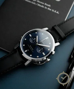 Eine Dress-Uhr mit einem 36.5mm Gehäuse im Vintage-Stil gefertigt aus Edelstahl mit einem Zifferblatt in blau und einer besonderen "sunburst"-Oberfläche.