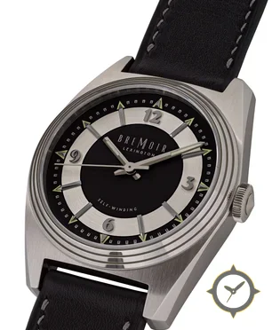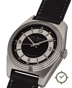 Eine Vintage-Uhr mit einem markanten 41.5mm Auftritt am Handgelenk, gefertigt aus Edelstahl mit einem Zifferblatt in schwarz und einer besonderen "matte black center with brushed silver inner ring"-Oberfläche.