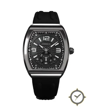 Eine Sport-Uhr gefertigt aus Edelstahl mit einem Zifferblatt in schwarz und einer besonderen "carbon-fiber weave"-Oberfläche.