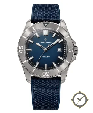 Eine Taucheruhr-Uhr mit einem 35mm Gehäuse im Vintage-Stil gefertigt aus Titan mit einem Zifferblatt in blau und einer besonderen "sunburst"-Oberfläche.