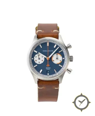 Eine Chronograph-Uhr mit einem 35.5mm Gehäuse im Vintage-Stil gefertigt aus Edelstahl mit einem Zifferblatt in blau und einer besonderen "matte"-Oberfläche.