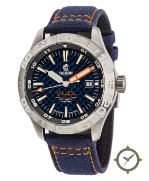 Eine Taucheruhr-Uhr mit einem vielseitigen 40mm Gehäuse, das an fast jedes Handgelenk passt, gefertigt aus Edelstahl mit einem Zifferblatt in blau und einer besonderen "carbon-fiber weave"-Oberfläche.