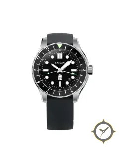 Eine Sport-Uhr mit einem markanten 44.5mm Auftritt am Handgelenk, gefertigt aus Edelstahl mit einem Zifferblatt in schwarz und einer besonderen "glossy/lacquer"-Oberfläche.