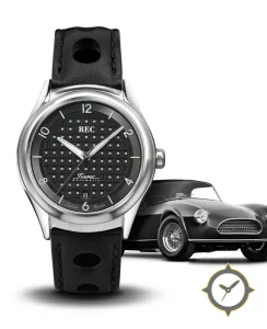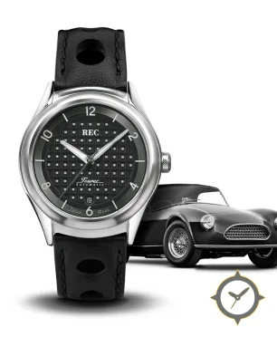 Eine Fahrer-Uhr mit einem markanten 46.5mm Auftritt am Handgelenk, gefertigt aus Edelstahl mit einem Zifferblatt in schwarz und einer besonderen "waffle (grid / clous de Paris)"-Oberfläche.