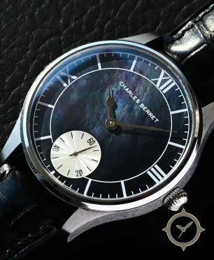 Eine Dress-Uhr mit einem markanten 43mm Auftritt am Handgelenk, gefertigt aus Edelstahl mit einem Zifferblatt in schwarz und einer besonderen "mother-of-pearl"-Oberfläche.