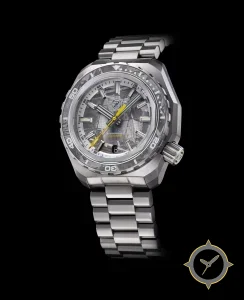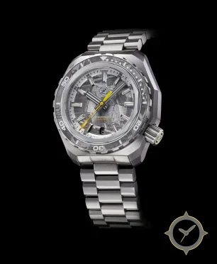 Eine Taucheruhr-Uhr mit einem markanten 49.5mm Auftritt am Handgelenk, gefertigt aus Edelstahl mit einem Zifferblatt in grau und einer besonderen "meteorite/textured finish with visible striations"-Oberfläche.