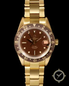Eine -Uhr gefertigt aus Gold mit einem Zifferblatt in braun und einer besonderen "glossy lacquer"-Oberfläche.
