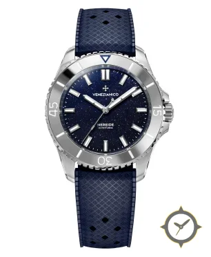 Eine Taucheruhr-Uhr mit einem 34mm Gehäuse im Vintage-Stil gefertigt aus Edelstahl mit einem Zifferblatt in marineblau und einer besonderen "aventurine (sparkling/starry)"-Oberfläche.
