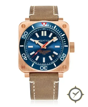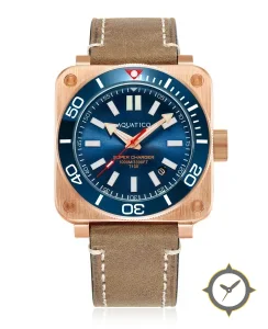Eine Taucheruhr-Uhr mit einem 35.5mm Gehäuse im Vintage-Stil gefertigt aus Bronze mit einem Zifferblatt in blau und einer besonderen "sunburst"-Oberfläche.
