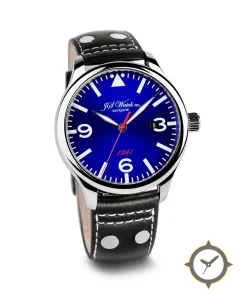 Eine Pilot-Uhr mit einem markanten 43mm Auftritt am Handgelenk, gefertigt aus Edelstahl mit einem Zifferblatt in blau und einer besonderen "sunburst"-Oberfläche.