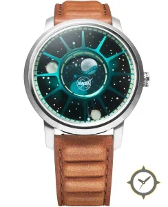 Eine Luxus-Uhr mit einem 35.5mm Gehäuse im Vintage-Stil gefertigt aus Edelstahl mit einem Zifferblatt in grün und einer besonderen "galaxy-style glossy with star speckles"-Oberfläche und einer wunderschönen Mondphasenanzeige.