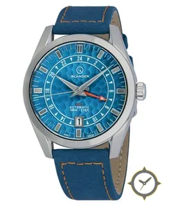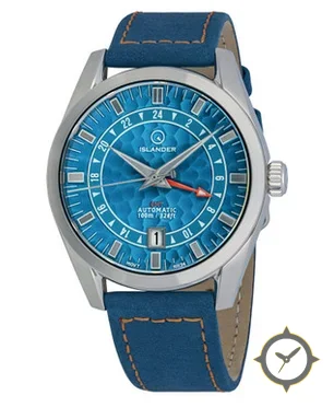 Eine GMT-Uhr mit einem 33mm Gehäuse im Vintage-Stil gefertigt aus Edelstahl mit einem Zifferblatt in blau und einer besonderen "hammered / guilloché texture"-Oberfläche und einer echten GMT-Funktion, mit der du eine zweite Zeitzone verfolgen kannst.