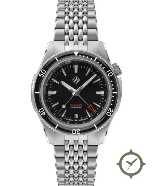 Eine Taucheruhr-Uhr mit einem 36mm Gehäuse im Vintage-Stil gefertigt aus Edelstahl mit einem Zifferblatt in schwarz und einer besonderen "brushed (vertical)"-Oberfläche und einer echten GMT-Funktion, mit der du eine zweite Zeitzone verfolgen kannst.