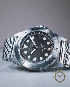 Eine Taucheruhr-Uhr gefertigt aus Edelstahl mit einem Zifferblatt in schwarz und einer besonderen "matte/grainy"-Oberfläche.