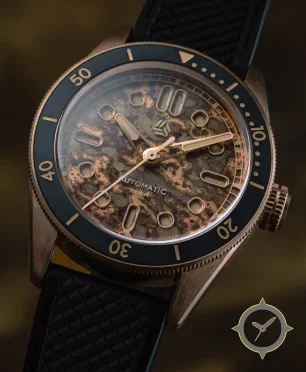 Eine Taucheruhr-Uhr mit einem 34.5mm Gehäuse im Vintage-Stil gefertigt aus Bronze mit einem Zifferblatt in braun und einer besonderen "oxidized bronze patina"-Oberfläche.