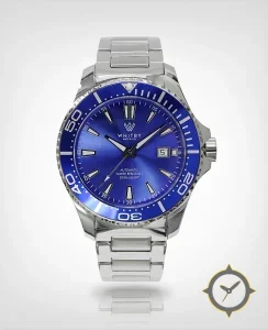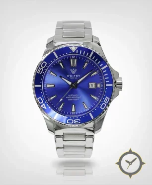 Eine Taucheruhr-Uhr mit einem markanten 43.5mm Auftritt am Handgelenk, gefertigt aus Edelstahl mit einem Zifferblatt in blau und einer besonderen "sunburst (radial brushed)"-Oberfläche.