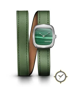 Eine Dress-Uhr mit einem vielseitigen 40.5mm Gehäuse, das an fast jedes Handgelenk passt, gefertigt aus Edelstahl mit einem Zifferblatt in grün und einer besonderen "malachite (banded stone)"-Oberfläche.