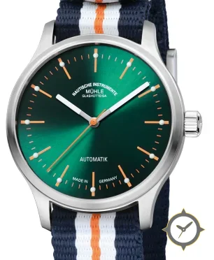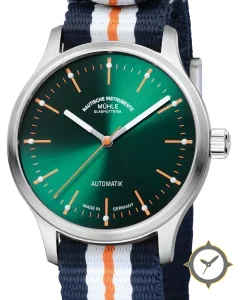 Eine Field-Uhr mit einem 33.5mm Gehäuse im Vintage-Stil gefertigt aus Edelstahl mit einem Zifferblatt in grün und einer besonderen "sunburst"-Oberfläche.