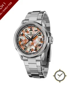 Eine Luxus-Uhr mit einem 31mm Gehäuse im Vintage-Stil gefertigt aus Edelstahl mit einem Zifferblatt in weiß und einer besonderen "mother-of-pearl"-Oberfläche.