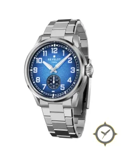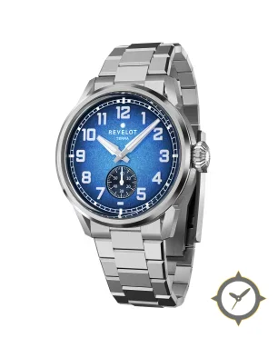 Eine Field-Uhr mit einem markanten 44mm Auftritt am Handgelenk, gefertigt aus Edelstahl mit einem Zifferblatt in blau und einer besonderen "frosted/granular gradient (lighter center, darker edges)"-Oberfläche.
