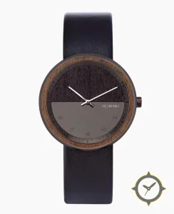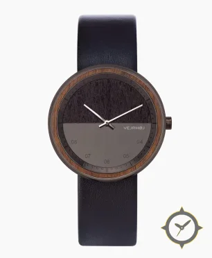 Eine Minimalistisch-Uhr mit einem 33.5mm Gehäuse im Vintage-Stil gefertigt aus Edelstahl mit einem Zifferblatt in braun und einer besonderen "wood grain (upper half) combined with brushed metal (lower half)"-Oberfläche.