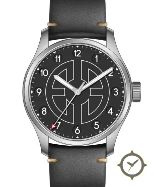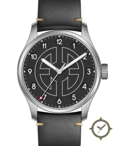 Eine Pilot-Uhr mit einem 35mm Gehäuse im Vintage-Stil gefertigt aus Edelstahl mit einem Zifferblatt in schwarz und einer besonderen "matte"-Oberfläche.