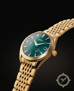 Eine Luxus-Uhr mit einem 37.5mm Gehäuse im Vintage-Stil gefertigt aus Gold mit einem Zifferblatt in grün und einer besonderen "guilloché"-Oberfläche.