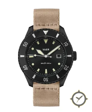 Eine Taucheruhr-Uhr mit einem vielseitigen 39mm Gehäuse, das an fast jedes Handgelenk passt, gefertigt aus Edelstahl mit einem Zifferblatt in schwarz und einer besonderen "sunburst"-Oberfläche.