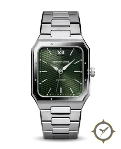 Eine Luxus-Uhr mit einem 37.5mm Gehäuse im Vintage-Stil gefertigt aus Edelstahl mit einem Zifferblatt in grün und einer besonderen "chevron guilloché / textured diagonal lines"-Oberfläche.