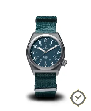 Eine Field-Uhr mit einem vielseitigen 41mm Gehäuse, das an fast jedes Handgelenk passt, gefertigt aus Titan mit einem Zifferblatt in türkis und einer besonderen "matte"-Oberfläche.