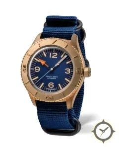 Eine Taucheruhr-Uhr mit einem markanten 47.5mm Auftritt am Handgelenk, gefertigt aus Bronze mit einem Zifferblatt in blau und einer besonderen "grained/matte texture"-Oberfläche.