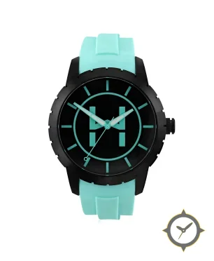 Eine Sport-Uhr mit einem vielseitigen 39mm Gehäuse, das an fast jedes Handgelenk passt, gefertigt aus Edelstahl mit einem Zifferblatt in schwarz und einem aufwendigen "logo"-Muster.