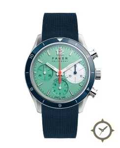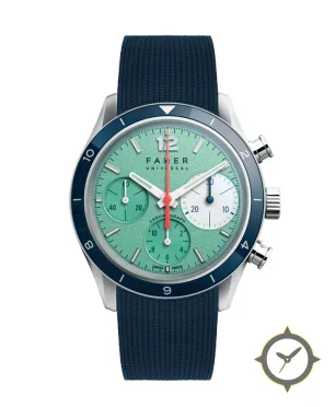 Eine Chronograph-Uhr mit einem 35mm Gehäuse im Vintage-Stil gefertigt aus Edelstahl mit einem Zifferblatt in türkis und einer besonderen "textured (grained) finish"-Oberfläche.
