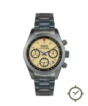 Eine Chronograph-Uhr mit einem vielseitigen 38.5mm Gehäuse, das an fast jedes Handgelenk passt, gefertigt aus Edelstahl mit einem Zifferblatt in gelb und einer besonderen "matte"-Oberfläche.
