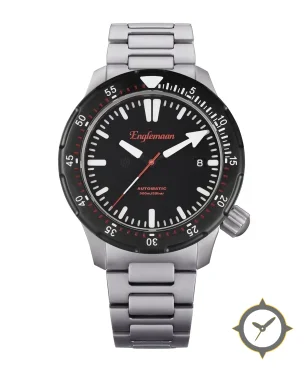 Eine Taucheruhr-Uhr mit einem 34.5mm Gehäuse im Vintage-Stil gefertigt aus Edelstahl mit einem Zifferblatt in schwarz und einer besonderen "matte"-Oberfläche.