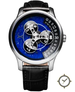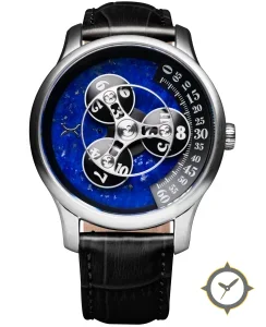 Eine Luxus-Uhr mit einem 34mm Gehäuse im Vintage-Stil gefertigt aus Edelstahl mit einem Zifferblatt in blau und einer besonderen "lapis-lazuli / marbled stone finish"-Oberfläche.