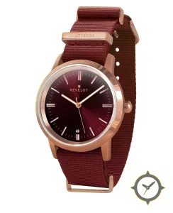 Eine Minimalistisch-Uhr mit einem vielseitigen 40mm Gehäuse, das an fast jedes Handgelenk passt, gefertigt aus Gold mit einem Zifferblatt in karmesinrot und einer besonderen "sunburst"-Oberfläche.