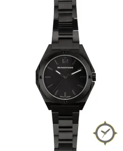 Eine Minimalistisch-Uhr mit einem vielseitigen 39mm Gehäuse, das an fast jedes Handgelenk passt, gefertigt aus Edelstahl mit einem Zifferblatt in schwarz und einer besonderen "matte"-Oberfläche.