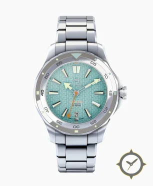 Eine Taucheruhr-Uhr mit einem 33.5mm Gehäuse im Vintage-Stil gefertigt aus Edelstahl mit einem Zifferblatt in türkis und einer besonderen "subtle raised basketweave texture"-Oberfläche.