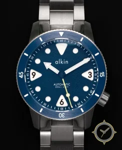 Eine Taucheruhr-Uhr mit einem 34mm Gehäuse im Vintage-Stil gefertigt aus Edelstahl mit einem Zifferblatt in blau und einer besonderen "grained/textured"-Oberfläche.