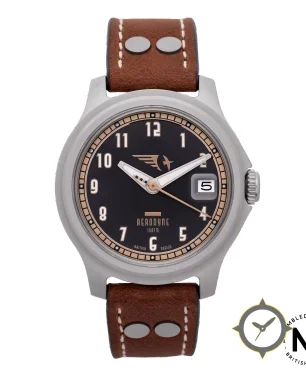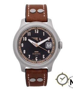 Eine Pilot-Uhr mit einem markanten 43mm Auftritt am Handgelenk, gefertigt aus Edelstahl mit einem Zifferblatt in schwarz und einer besonderen "matte"-Oberfläche.
