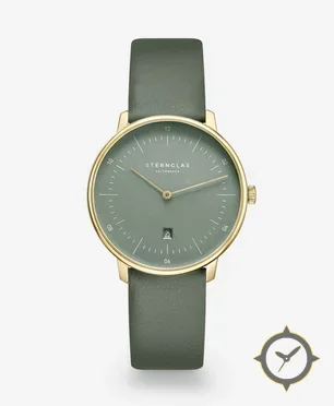 Eine Minimalistisch-Uhr mit einem 36mm Gehäuse im Vintage-Stil gefertigt aus Gold mit einem Zifferblatt in grün und einer besonderen "matte"-Oberfläche.