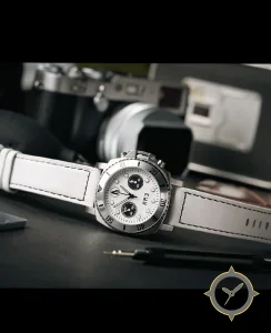 Eine Chronograph-Uhr mit einem markanten 43mm Auftritt am Handgelenk, gefertigt aus Edelstahl mit einem Zifferblatt in weiß und einer besonderen "smooth"-Oberfläche.